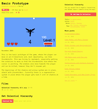 From the outset, this project's brief was to have a theme based around myth or folklore - I decided to base mine around Pseudo-Dionysius the Areopagite's 'De Coelestia Hierarchia' and particularly his view on angels. Thus, the basic setting for having to fight your way through the different levels of Hell was born.